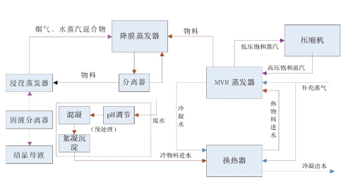 MVR處理工藝,即機械蒸汽在壓縮技術(shù)是—種新型節能蒸發(fā)技術(shù),其工作過(guò)程是低溫位的蒸汽經(jīng)壓縮機壓縮,溫度、壓力提高,熱燴增加,然后進(jìn)入蒸發(fā)器換熱冷凝,以充分利用蒸汽的汽化潛熱能。因此,在蒸發(fā)流程中的—效蒸發(fā)器,便不再需要大量的蒸汽作為主要熱源,只需不足蒸發(fā)量10%的蒸汽作為補充蒸汽來(lái)彌補不可避免的熱交換損失及系統散熱。